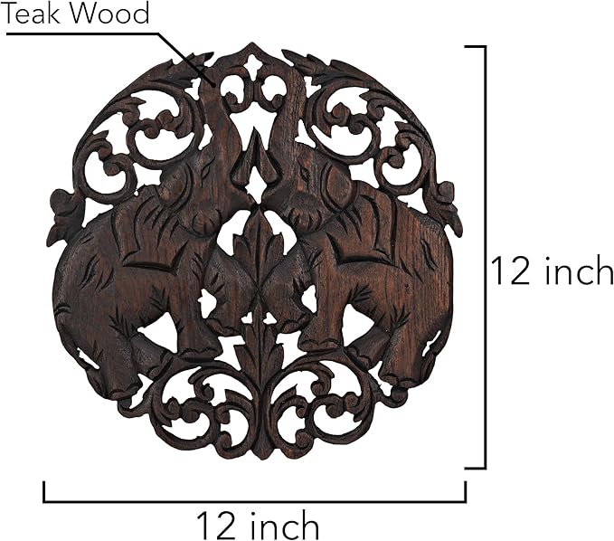 - A pair of graceful elephant dance and hold their trunks high in this circular Teak Wood relief panel. The calves playfully push their trunks together to test their strength. Artisan Thanat masterfully works with chisel and knife to achieve the fine detail of this amazing piece.