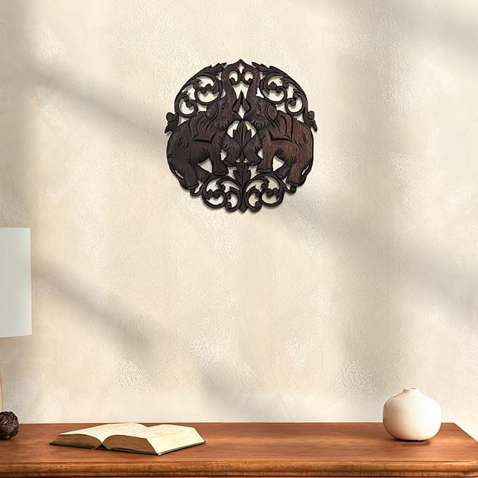 AeraVida Elaborate Circular Double Thai Elephant Hand Carved Teak Wood Wall Art