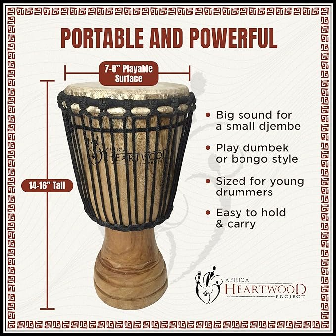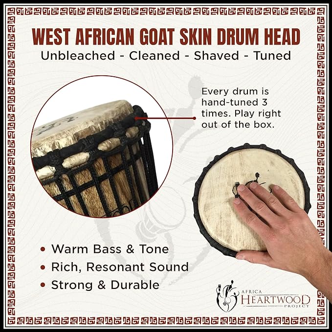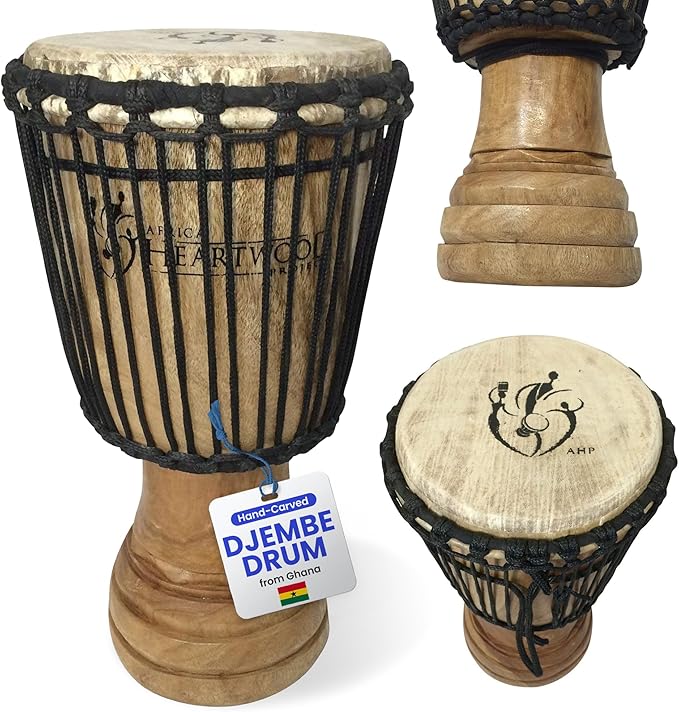 Africa Heartwood Project Hand-Carved Djembe Drum from Ghana – 8″x16″ Authentic Classical African Djembe – Solid Wood Shell & Natural Goat Skin – Ready to Play Out of the Box Musical Instrument